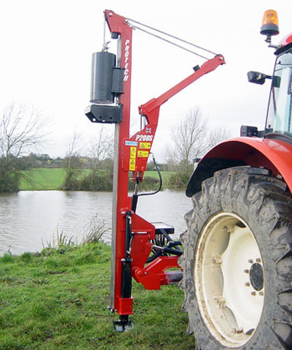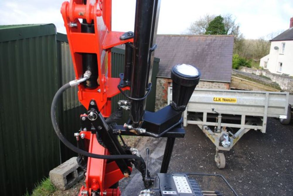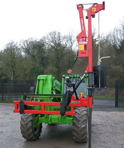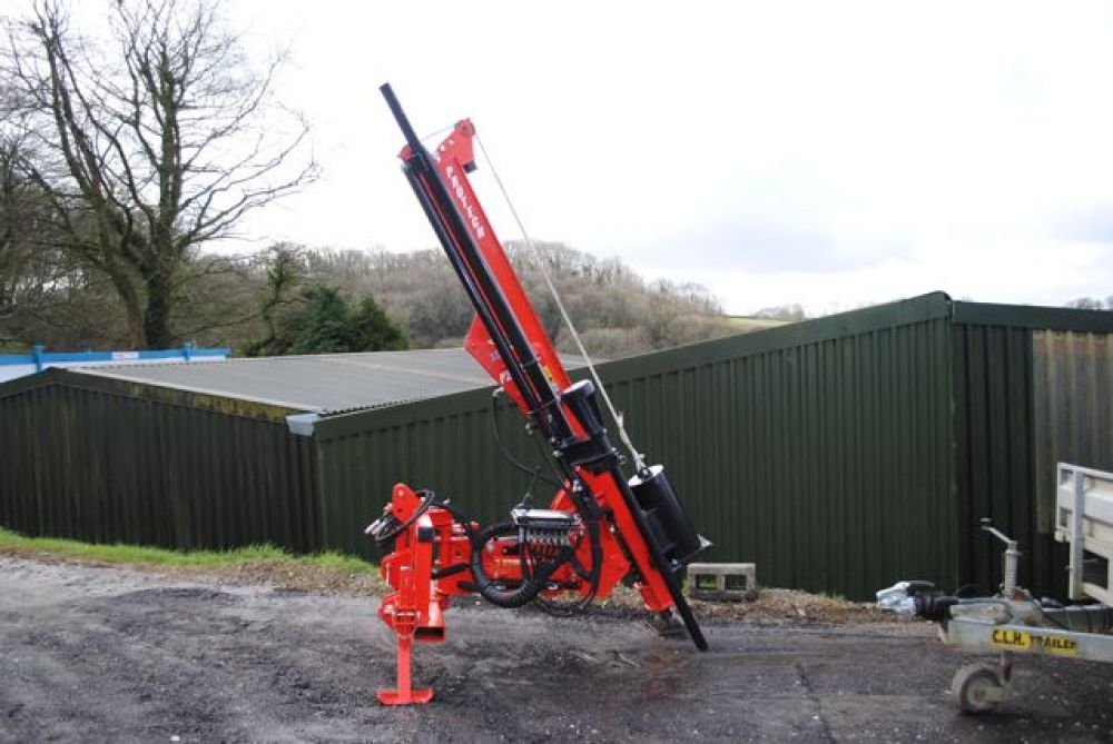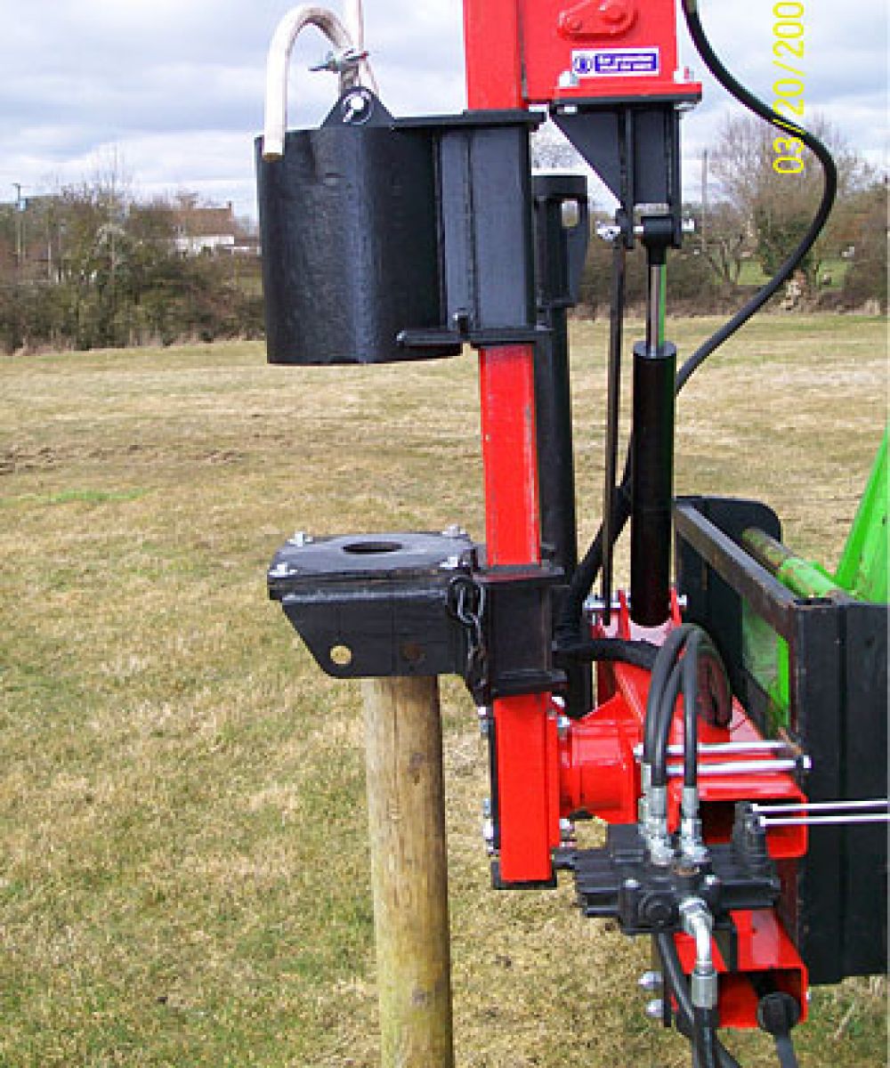 A fully hydraulic rear mounted post driver designed for the Farmer/Contractor, Equipped with a 210 kg hammer, 120 degree hydraulic slew with 250 mm telescopic extensions and mast tilts,