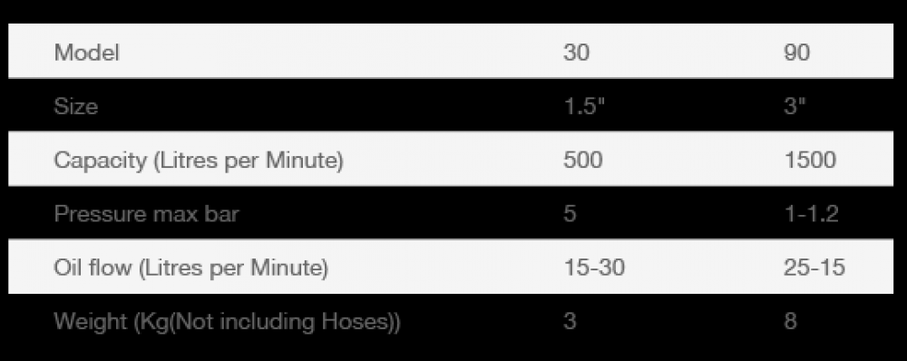 Hydraulic Slurry Pumps Using our hydraulic pumps could not be easier, just connect to the tractors external hydraulics and start the pump. The pumps have a capacity of 500 to 2,500 litres per minute. The pumps are low weight and easy to move, these features have made these hydraulic pumps very popular. Our hydraulic pump comes in three models dependant on application. Model 30 is designed for water and urine pumping, Model 90 is for water, urine and lighter liquid manure and Model 150 is suitable for all sorts of pumping in the agricultural and construction sectors.
