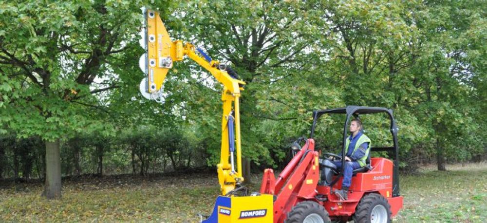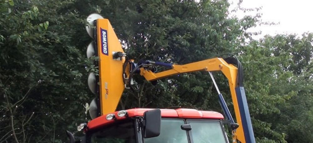BOMFORD has extended its range of saw-blade cutting attachments with the addition of the new ProSaw, suitable for use with most of Bomford reach-arm mower. An alternative model is available, that includes a frame – the HRF (Hydraulic Reach Frame) - that enables the ProSaw to be mounted onto a telescopic handler or tractor loader. The ProSaw is capable of cutting through branches up to 20cm (8.0in) diameter, making it ideal for handling over-grown vegetation or where conservation stewardship schemes require hedges to be cut less frequently, and so beyond the scope of normal flail heads. Three versions are available for use on conventional reach-arm mowers, which have cutting widths of 1.6m, 2.0m and 2.4m. The ProSaw comprises of four circular saw blades that are mounted in-line and are hydraulically driven with a maximum power consumption of just 20Kw. For greater versatility all three models can also be mounted on a special frame that allows them to be used on a telescopic handler. The ProSaw is carried on the HRF extendable carriage, that is adaptable for most common telescopic handler and tractor loader headstocks. For transport, the ProSaw head is manually folded to bring it within the overall width of the telescopic handler or tractor. Two versions of the HRF carriage are available, both of which incorporate an integral side boom facility that enables the ProSaw to be extended sideways by up to 2.8m or 3.3m. The frame also features a hydraulic break-back that allows the ProSaw to swing up to 45° backwards in the event of an obstruction being hit, or the saw being over-loaded.
